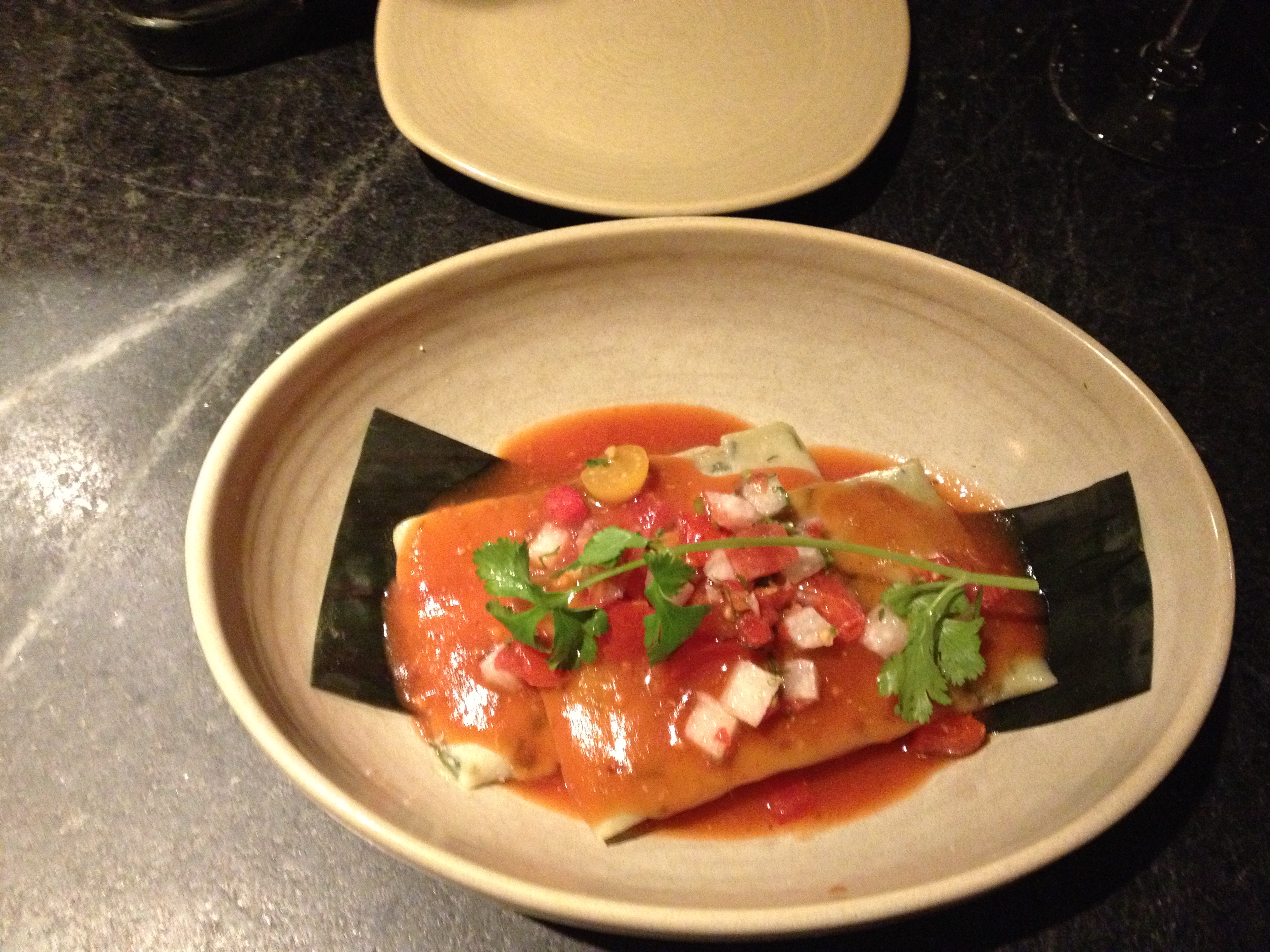 This is Dzotobichay, probably one of the best Mexican dishes I have ever had.  Pronounced ts’o tobil chay the dish is a tamale of fresh-ground corn masa with Nichols Farm Swiss chard, creamy pepita butter, egg, tomato-habanero sauce and ground cherry salsa.  I also imbibed a Topolo Margarita: Herradura añejo tequila, Torres orange liqueur, house made limonada, shaken tableside.  Goooooooaaaaaaaaaaal!